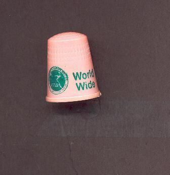 Pink plastic Advertising thimble with green printing. ÒFTDÓ in logo (Florists) and ÒWorld WideÓ U.S.A. 7 in apex.