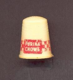 Cream coloured plastic Advertising thimble with red letteruing. Advertising ÒPurina ChowaÓ in logo and ÒTrust Purina QualityÓ. U.S.A. 13 in apex.