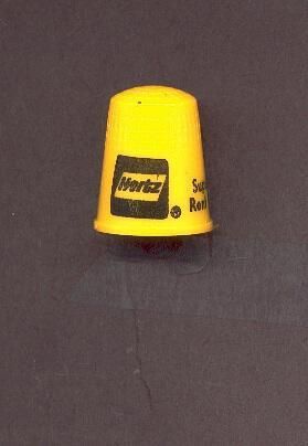 Yellow plastic Advertising tyhimble with black pinting. Advertising ÒHertzÓ in logo and ÒSuper Star Rent A CarÓ. U.S.A. 15 in apex.