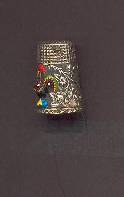 Tall silver plated thimble with wide border of embossed leaves and flowers with the good luck cock of Portugal in color. Waffle type indentations on side, round on top with a 4 pounted mark in center. Inside gold washed. No marks.