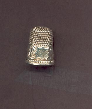 Sterling silver thimble with narrow band of raised dots above rim.Wide band aove of 1/2 daisies with a cartouche. Initials A.R. Inside apex is Ketcham McDogall mark with Sterling and 9.
