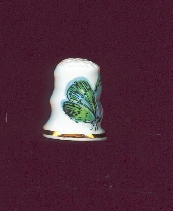 White glazed bone china thimble ,slightly fluted at rim. Gold band at rim.Large green and pink butterfly decal on side. Knurling on rounded top. Inside stamped ÒFine Bone China Queensway Made in EnglandÓ