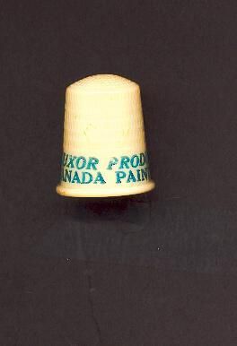 Cream coloured plasric Advertising thimble with blue printing.Advertising ÒLuxor Products Canada Paint Co.Ó Waffle indentations on side, round on top.