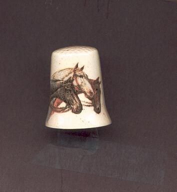 Beige coloured glazed pottery thimble with flecks of brown throughout.Three horses heads on one side. Decal.No marks. Slightly fluted. No marks.