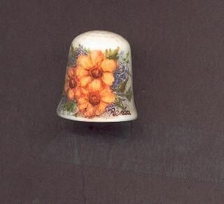 White glazed china thimble with slight fluting at rim. Hand painted floral design - 3 yellow-brown daisy-like flowers surrounded by blue and green leaves. Signed Renee on outside. Inside hand painted written in black.
