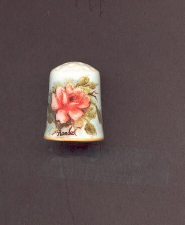 White glazed china thimble with hand painted design. Floral design of a red rose surrounded by green leaves and a bud. Signed ÒReneeÓ Inside ÒHand PaintedÓ written in black.