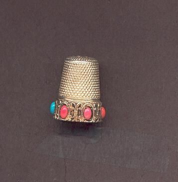 Silver thimble with a band of coral and turquoise stones. Knurling from band to and over top. Center top has mark -probaly of Lotthammer-Eber, Pforzheim, Germany. 7 stones around gilt band- were probably all coral when made, now 5 coral, 2 turquoise.Inside gilt.