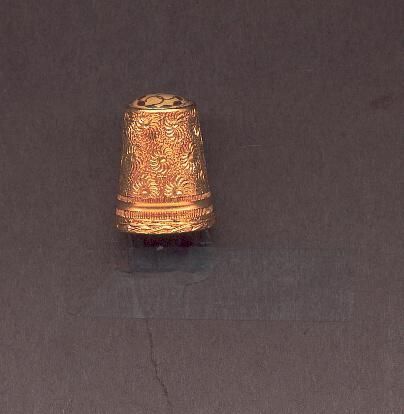 Gold coloured metal thimble with added patterned rim.Elongated ovals - fish? - design. 2 narrow rows of vertical lines with a narrow plain band between. Remainder of thimble to top has an overall incised daisy design. On top is a plastic disc with the logo of Collectors Circle - entwined back to back CÕs and Ò1982Ó. Stamped ÒAustriaÓ on plain band.
