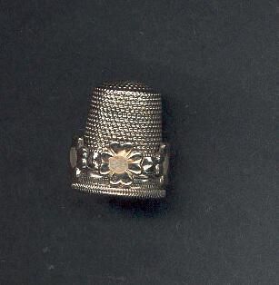 Silver coloured metal, probably nickel,. thimble with rolled rim Vertically lined. Added band of petalled flowers with white mother-of-pearl centers. Paper label inside says ÒMade in AustriaÓ.