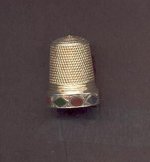 Silver thimble with raised band at rim. Band has stone inserts -oval and diamond shaped and cartouche. multi-coloured stones - red, geeen, mottled. No marks.