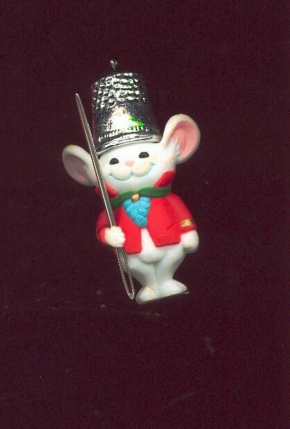 Thimble Ornament. Red and white plastic mouse with metal thimble hat, carrying a needle in one hand.Stamped on back of thimble hat Ò18982 Hallmark Cards Inc.Ó Stamped 5 on red coat on back to signify 5th of series. Box marked Made in Hong Kong. .