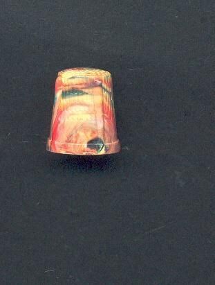 Plastic multicoloured thimble with 4 pillars to prevent rolling. Raised band at rim, then wide plain band above.Vertical indntations to top, round on top.6(size) in apex.