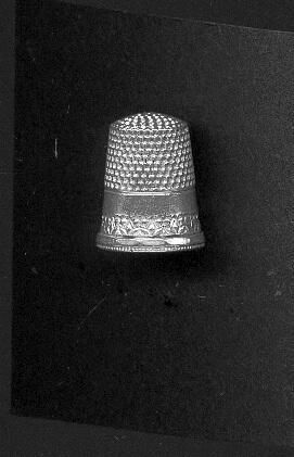 Silver thimble with beaded rim. Raised facetted band above rim. Narrow floral band above, then narrow plain band above before knurling to and over top. Size stamped on the plain band. Ketcham & McDougall logo in apex with Sterling below it.