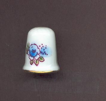 White glazed china thimble with decal of blue and red flower design. Thuimble slightly fluted with gold line at rim.No marks.
