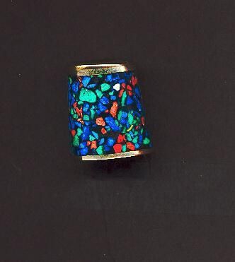 Enamelled metal thimble. Flat silver coloured top, hand punched. Side enamelled in shades of blue and pink.Inside looks like brass.