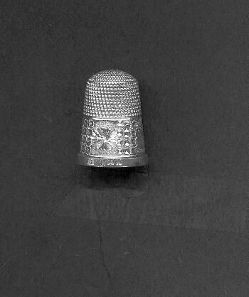 Silver thimble with raised band. Wide band of pattern - 4 chrysanthenums with 4 dividing patterns between them. Divider consists of 3 rows iof 4 cut circles. Flowers are on a stippled background. English hallmarks on band- Birmingham 1901 JF - James Fenton maker.