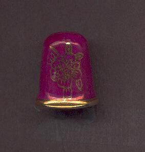 Maroon or plum coloured glazes china thimble, slightly flued at rim. Gold line at rim and gold design one side. Stamped Japan inside.