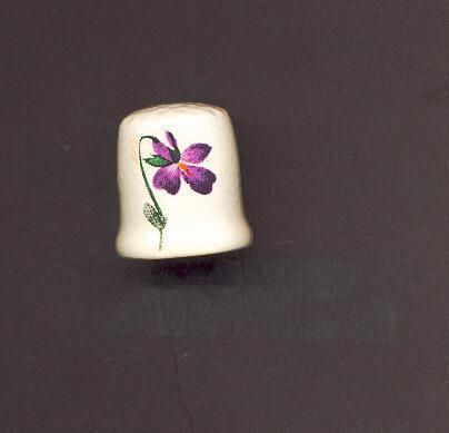 Cream coloured pottery thimble with screen printed violet on one side. Label inside, paoper, says ÒMade in EnglandÓ.