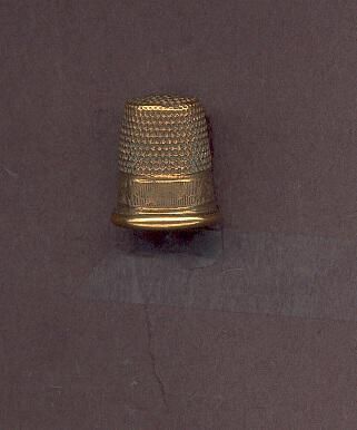Braaa thimble with rolled rim. Band of pattern - maple leaves on a vertically striped band. No marks.