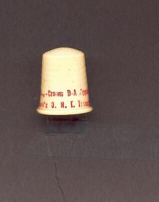 Cream coloured early type plastic with rolled lined rim. Red printing Advertising ÒÓThree Great Names in Sewing Crown D-A Zippers Clarks O.N.T. Threads L&P CoatsÓ In apex B&B St. Paul U.S.A.