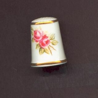 White bone china glazed thimble with gold bands top and rim. Slightly fluted at rim. Hand painted thimble signed ÒJ.DraperÓ Red rose spray with green leaves one side, leaf spray near signature.Royal Worcester logo and Fine Bone China England inside in black.