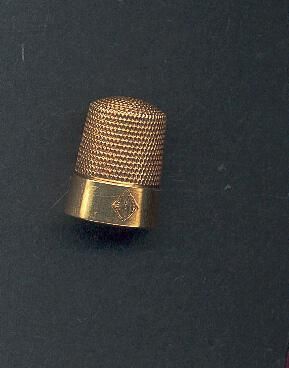Gold thimble with wide plain nand. Inituals oin band in a diamond shape EMA. Knurling from band to and over top. Simon Bros. logo in apex with 14K.