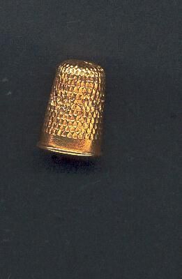 Gold coloured thimble, heavy, rolled rim with narrow plain band above. Triangular knurling from plain band to and over top. Few holes. Seems to be reinforced inside. No marks.