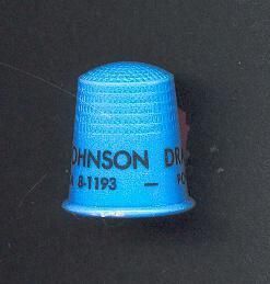 Blue plastic Advertising thimble with black printing. Rolled rim. Advertising ÒJohnson Drapery Ca8 - 1193 PortlandÓ Inside apex small 2, large 11.