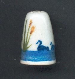Tall conical shaped hand painted thimble. Gray white colour, glazed with ble water, ducks, and yellow water iris with green leaves. Inside unglazed and signed AH 82.
