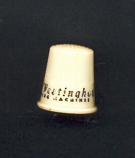 Cream coloured plastic Advertising thimble,early type, with black lettering.Rolled rim, wide band above with advertising ÒFree-Westinghouse Sewing MachinesÓ Vertical ridged lines from band to top of thimble, round indentations on top. Inside apex U.S.A.10.