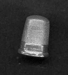 Silver thimble with English hallmarks. Raised facetted rim. Wide plain band with size Ò4Ó makers name ( --&S), anchpr (Birmingham), lion passant and the year - could be 1897,1922 0r 1947 - not clear anough to tell.