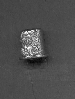 Pewter thimble with extended rim/ Raised design , side seamed. One side orientalm figure with child, other side head only of Oriental figure. No marks