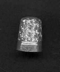 DORCAS thimble - silver outside, silver inside, steel center., Chrysanthenum pattern allover above a plain band. Stamped oin band CH (Maker Charles Horner) 9 (size) and Dorcas.