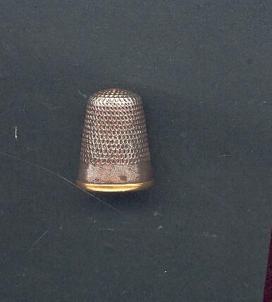 Brass lined steel thimble. Rolled brass rim. with wide band above then knurling to and over top. No marks.
