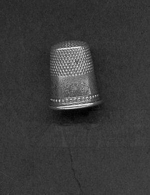 Metal thimble with rolled rim. Band of raised dots above rim. Wide plain band with size stamped oin then knurling to and over top. No other marks.