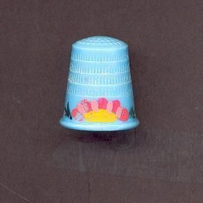 Blue plastic thimble with rolled rim. Wide band above rim with painted floral design - green leaves, pink and yellow flowers. In apex ÒMade in England Non-FlamÓ