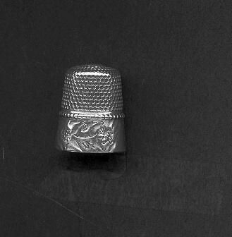 Silver thimble with wide band of pattern at tim. Flowers, roses and 2 beens on band,. Stamped Sterling and an ancholr (Goldsmith Stern) Inside the logo if Stern Bros. anbd sixe. Row of beading above the band then knurling to and over top.Hole in knurling.