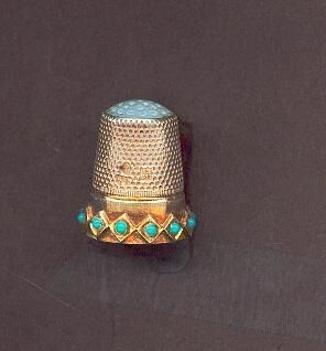 Silver thimble with band of turquoise stones at rim. The band is gilt as is the inside of the thimble. The stones are set in a gold diamond shape -12 of them around. Knurling to top. Stamped in knurling 7, sterling and 925. Moonstone top.