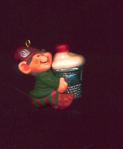 Hallmark thimble Elf for 1983. Christmas ornament. Multicoloured elf holding metal thimble filled with ice cream and cherry. Stamped Hallmark Cards Inc. 1983
