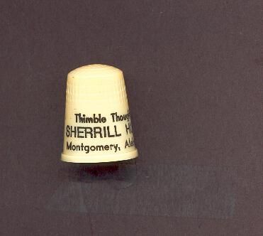 Plastic Personal thimble, cream coloured with black print. ÒThimble Thoughts Sherrill Hunt, Montgomery, AlabamaÓ, U.S.A. 11 in apex.