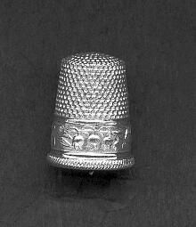 Aluminum thimble with lined rim. Wide band if Lily of the Valley pattern. No marks.,