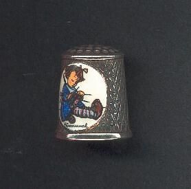 Silver plated thimble with an enamelled picture in oval shape added to body.Side seamed. Silver body of thimble has a pattern of diamonds with dots in the center. White enamel oval disc has been added with a boy in bluye, knitting and the Hummel signature.on back is Z shape with Ò1st Editionb, Hummel and 1983 frist edition. ITop has knurling. Inside West Germany Silver Plated.