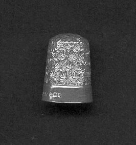 Silver thimblke with wide plain band at rim.Chrysanthenum pattern all-over abiove band. Stamped on rim 6 , J.S.&S (Joiseph Swan & Son), Birmingham 1940. Repair marks inside top.
