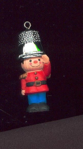 Christmas thimblke ornament. Soldier boyt in red jacket, blue pants with a silver coloured metal thimble for a hat. on bavk of thimble is stamped ÒHallmark Cards Inc.Ó
