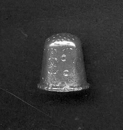 Silver thimble with raised patterned rim. Side seamed.All-over pattern of circles, flowers. Hand made indentations on top. No marks.