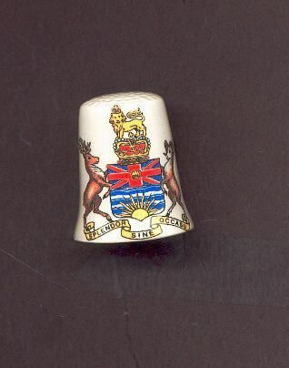 Creamy white glazed slightly fluted china thimble. British Columbia coat of arms one side in colour. Other side in black printed British Columbia. No marks.