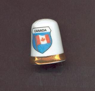 Whitebone china glazed thimble with wide gold line at rim. Crest on 2 sides in shield shape in colour blue with Canadain flag and Canada at top in black letters. Stamped inside ÒSheer Elegance Fine English Bone ChinaÓ in blue.