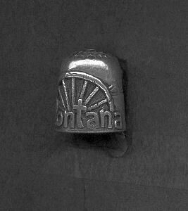 Silver hand crafted thimble. Squat shape. Indentations on top with gold nugget in center. Souvenir type. Bucking horse with cowboy ione side. ÒMontanaÓ worked into wagon wheel other side. Signed inside ÒTom Edwards 82 Ò