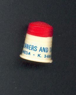 Red top early plastic Advertising thimble. Cream colour with rolled rim, red top and blue peinting. Advertising ÒNathanÕ;s Cleaners and Tailors 4409 Almeda - K3-6644Ó -Inside apex B&B St. Paul, U.S.A.
