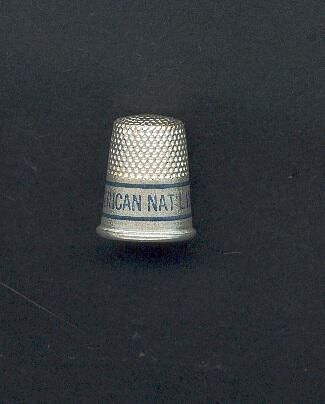 Aluminum Advertising thimble with rolled rim.Wide band with blue printing and blue lines above and below.Advertising ÒAmerican NatÕl Ins. Co. Galveston, Texas*Ó No marks.